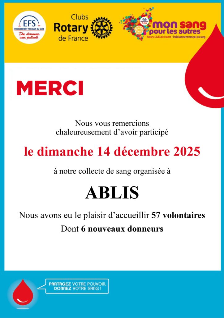 L’Etablissement Français du Sang vous remercie pour votre mobilisation lors du précédent don du sang, le 08 décembre 2024.